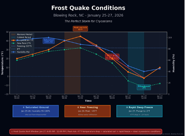 The main precursors are saturated ground from thaw or rainfall prior to a cold air mass moving in, minor snow cover without enough depth to insulate the ground, and a rapid temperature drop from near freezing to well below 0°F within 16 to 48 hours. That's a Blue Ridge winter almost exactly - wet soil from fall rain, thin snow cover at elevation, and the sharp overnight temperature swings that any seasonal homeowner in Blowing Rock knows well. The phenomenon is driven more by rapid temperature changes and soil moisture than by latitude alone, which is why southern states with unusually cold nights can experience them. The mountains of Western North Carolina check every box.